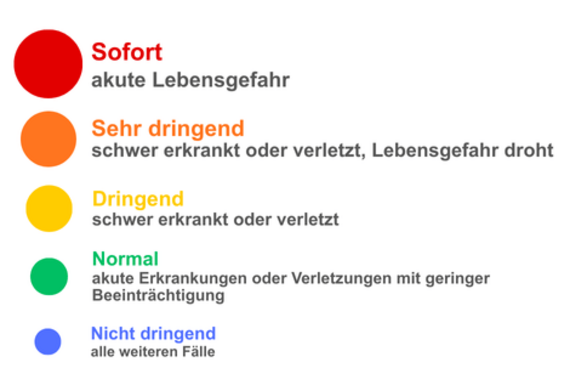 Die Reihenfolge der Behandlung richtet sich danach, wer unsere medizinische Hilfe am dringendsten benötigt. Um das sicherzustellen, arbeiten unsere Fachkräfte nach dem Manchester-Triage-System. Im Rahmen der Ersteinschätzung ordnen wir unsere Patienten anhand seiner Hauptsymptome einer definierten Dringlichkeitsstufe und Farbe zu.